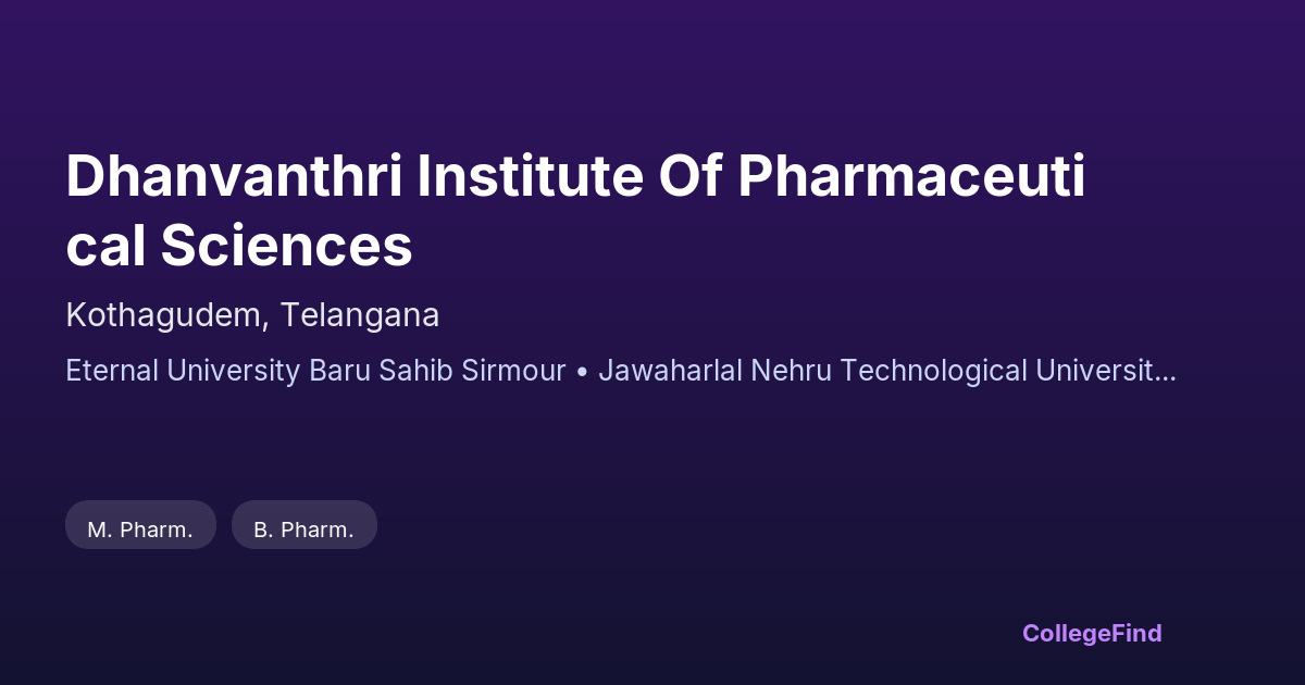 Dhanvanthri Institute of Pharmaceutical Sciences, established in 2007, is located in Kothagudem, Telangana. It operates as a private unaided institution and is affiliated with Eternal University, Baru Sahib Sirmour. The college focuses on pharmaceutical education, offering programs designed to prepare students for careers in the pharmaceutical industry. With a campus area of 3 acres, the institute provides the necessary infrastructure for academic and practical learning. Being an affiliated college, it follows the curriculum and guidelines set by the university. While specific placement statistics and average salary packages are not provided, students can expect a focus on both theoretical knowledge and practical skills relevant to the field. The institute might be suitable for students seeking pharmaceutical education within Telangana under the affiliation of Eternal University. Prospective students should consider visiting the campus or contacting the administration for detailed information on placements and facilities before making a decision.
