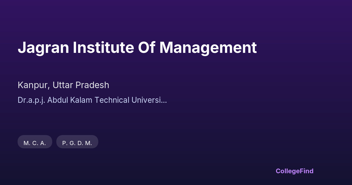 Jagran Institute of Management, located in Kanpur, Uttar Pradesh, was established in 2006 and is affiliated with Dr. A.P.J. Abdul Kalam Technical University. The college operates as a private un-aided institution and offers a range of management programs. The campus spans an area of 1.25 acres, providing a compact yet functional environment for learning. The infrastructure supports academic activities with well-designed classrooms and dedicated spaces for student interaction. The institute emphasizes creating a focused atmosphere conducive to management studies, with facilities aimed at supporting both theoretical and practical learning. Its location in Kanpur offers students access to a growing urban center, balancing academic life with city amenities.
