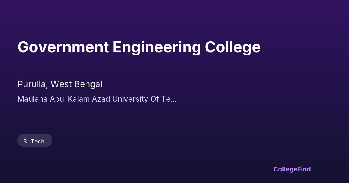 Government Engineering College, Purulia, established in 2016, is an affiliated institution under Maulana Abul Kalam Azad University of Technology. Managed by the state government of West Bengal, the college offers engineering education aligned with the university's curriculum and standards. Located in Purulia, the college aims to provide a solid technical foundation to its students through a range of engineering programs. While specific details about placement percentages, average salary packages, and campus area are not highlighted, the institution focuses on developing practical skills and knowledge essential for the engineering profession. As a relatively new college, it continues to build its academic and infrastructural resources to better serve its student community.