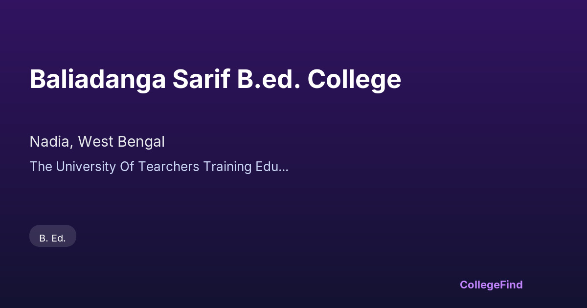 Baliadanga Sarif B.Ed. College is an affiliated private un-aided institution located in Nadia, West Bengal. The college is connected with the University of Teachers Training Education Planning and Administration, ensuring its curriculum aligns with recognized educational standards. While specific details about its establishment, campus area, placement rates, and average salary packages are not provided, the college focuses on preparing students for a career in education through its Bachelor of Education program. Its affiliation supports adherence to updated teacher training methodologies, potentially benefiting those seeking formal qualifications to enter the teaching profession. Prospective students should consider visiting the college or contacting administration directly to gain further insight into campus facilities, faculty expertise, and career support services before making a decision.