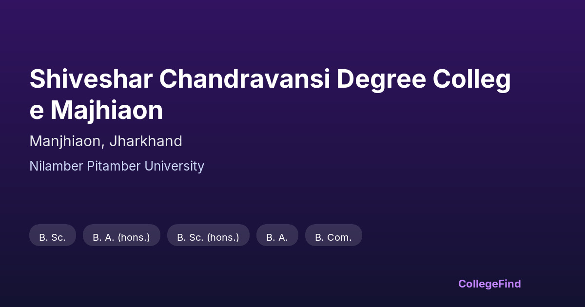 Shiveshar Chandravansi Degree College Majhiaon, established in 2009, is an affiliated college located in Manjhiaon, Jharkhand. The college operates under the management of Nilamber Pitamber University, to which it is affiliated. Spanning a campus area of 5.25 acres, the institution provides a range of undergraduate programs in line with university guidelines. As an affiliated college, it follows the academic standards and curriculum set by Nilamber Pitamber University. Although specific placement statistics and average salary packages are not available, the college focuses on delivering higher education opportunities to students in the region. Its location in Manjhiaon offers access to local communities seeking degree courses affiliated with a recognized university.