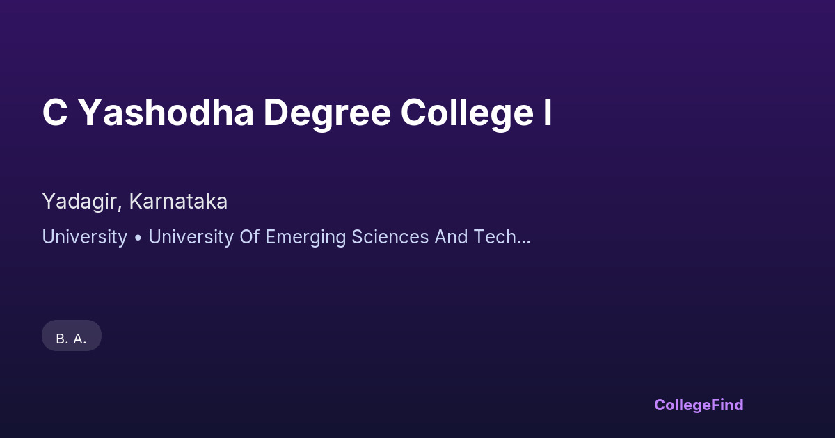 C Yashodha Degree College I, located in Yadagir, Karnataka, was established in 2018 and operates under state government management. As an affiliated college, it maintains a close connection with its university, ensuring that its curriculum aligns with academic standards and industry requirements. The campus spans 40 acres, providing ample space for academic and extracurricular activities. The college places a strong emphasis on preparing students for the job market through skill development and practical learning. While specific placement percentages and average salary packages are not provided, the institution is focused on enhancing career opportunities and supporting students as they transition into the workforce. With its commitment to quality education and career readiness, C Yashodha Degree College I aims to equip students with the knowledge and skills necessary for sustainable professional growth.