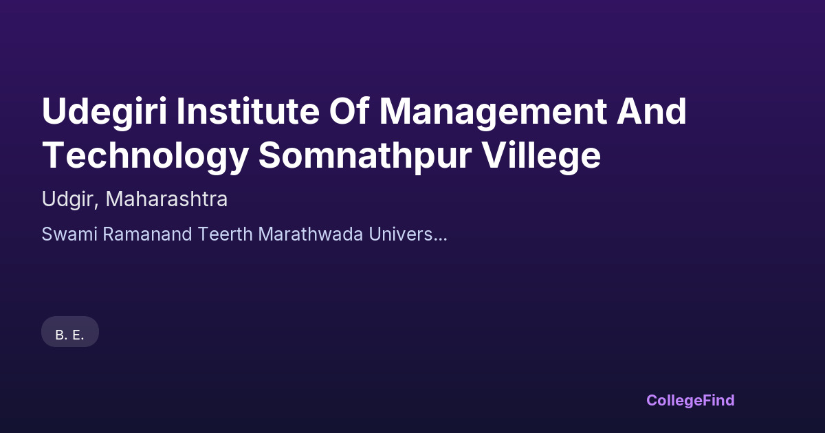 Udegiri Institute of Management and Technology, located in Somnathpur village near Udgir, Maharashtra, was established in 2009. It operates as a private unaided institution affiliated with Swami Ramanand Teerth Marathwada University. The college offers a focused academic environment aimed at delivering quality education in management and technology fields. Spread over a 35-acre campus, the institute provides adequate infrastructure to support both learning and extracurricular activities. While specific placement statistics and average salary packages are not available, the college emphasizes practical learning and skill development to prepare students for industry challenges. Its affiliation ensures adherence to university standards and curriculum requirements. Overall, Udegiri Institute serves as a dedicated educational option for students in the region seeking undergraduate and postgraduate programs aligned with industry needs.