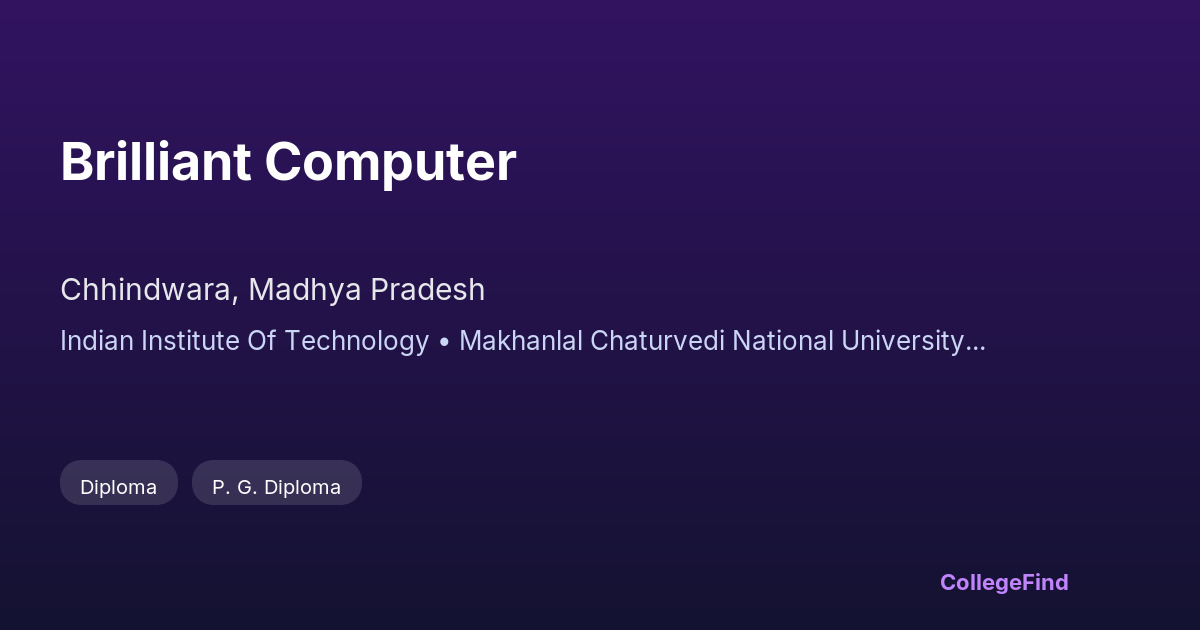 Brilliant Computer, located in Chhindwara, Madhya Pradesh, was established in 2011 and operates as a recognized center affiliated with the Indian Institute of Technology. Managed by a university, the institution focuses on providing solid academic training in computer science and related fields. The affiliation with IIT ensures that the curriculum is aligned with contemporary industry standards, preparing students effectively for the job market. While specific placement statistics and average salary packages are not publicly available, the college emphasizes career readiness through practical learning and industry interaction. Students benefit from exposure to cutting-edge technology and faculty guidance aimed at enhancing employability. Brilliant Computer aims to equip its graduates with the skills and knowledge required to succeed in competitive technology roles.