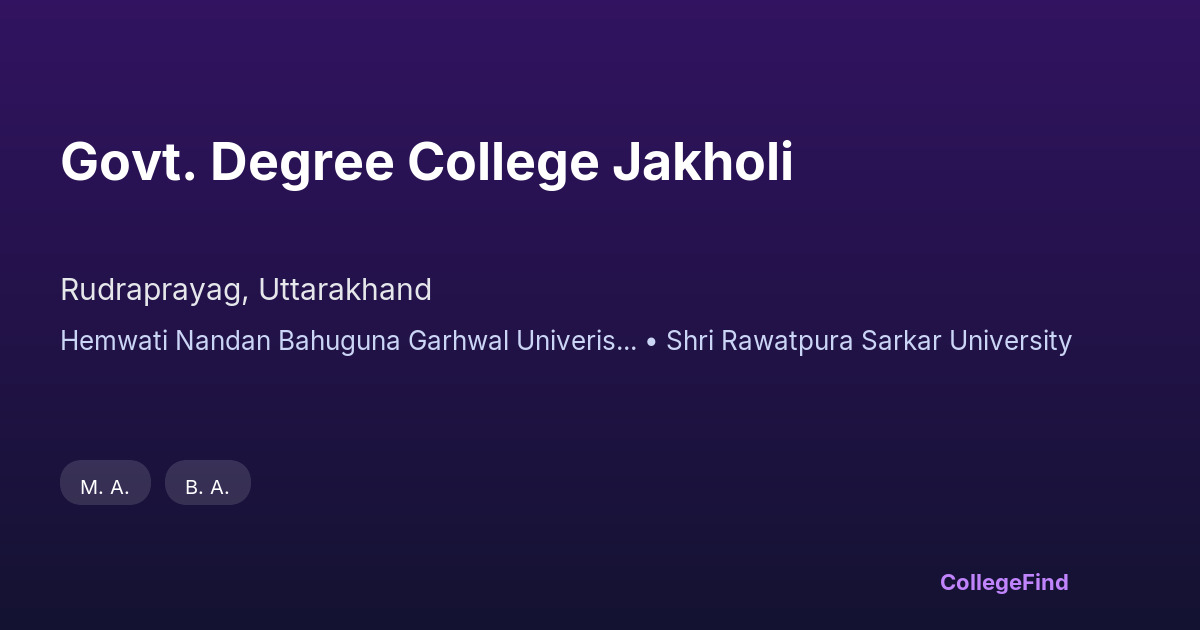 Government Degree College Jakholi, located in the scenic district of Rudraprayag, Uttarakhand, was established in 2001. Affiliated with Hemwati Nandan Bahuguna Garhwal University, the college operates under the management of the state government. It serves as an accessible higher education option for students from nearby rural and mountainous areas, providing them with opportunities to pursue undergraduate studies without relocating far from home. The campus spans an area of 9.45 acres, offering a calm and natural environment conducive to learning. Its location within Rudraprayag allows students to connect with the cultural and natural heritage of the region, which can be particularly appealing for those interested in studies related to rural development, environmental sciences, and local history. The college focuses on imparting quality education aligned with university standards, supporting the academic growth of its students in a setting that reflects Uttarakhand’s unique landscape.