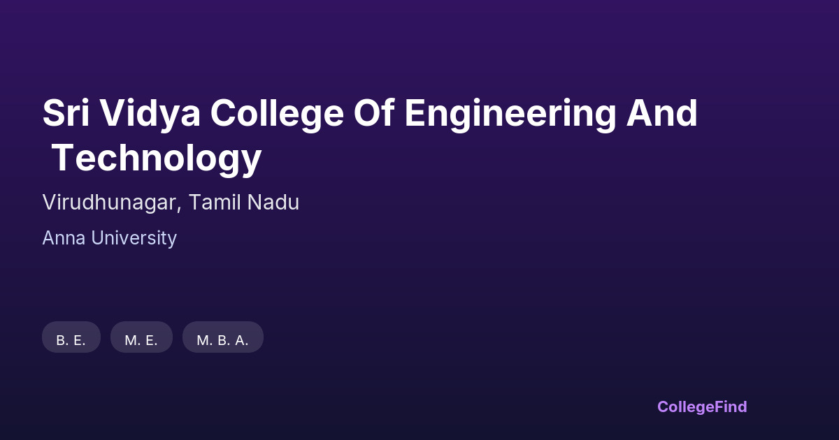 Sri Vidya College of Engineering and Technology, located in Virudhunagar, Tamil Nadu, was established in 2008. As a private unaided institution affiliated with Anna University, it offers undergraduate and postgraduate engineering programs. The college spans an 11.49-acre campus, providing students with essential academic and recreational facilities. Its curriculum follows the guidelines set by Anna University, ensuring a standardized engineering education. The institution aims to equip students with practical skills alongside theoretical knowledge, preparing them for professional challenges. While specific placement statistics and average salary packages are not publicly detailed, the college maintains a focus on fostering industry connections and skill development to support student careers. Overall, Sri Vidya College of Engineering and Technology serves as an option for engineering aspirants seeking education within Tamil Nadu's academic framework.