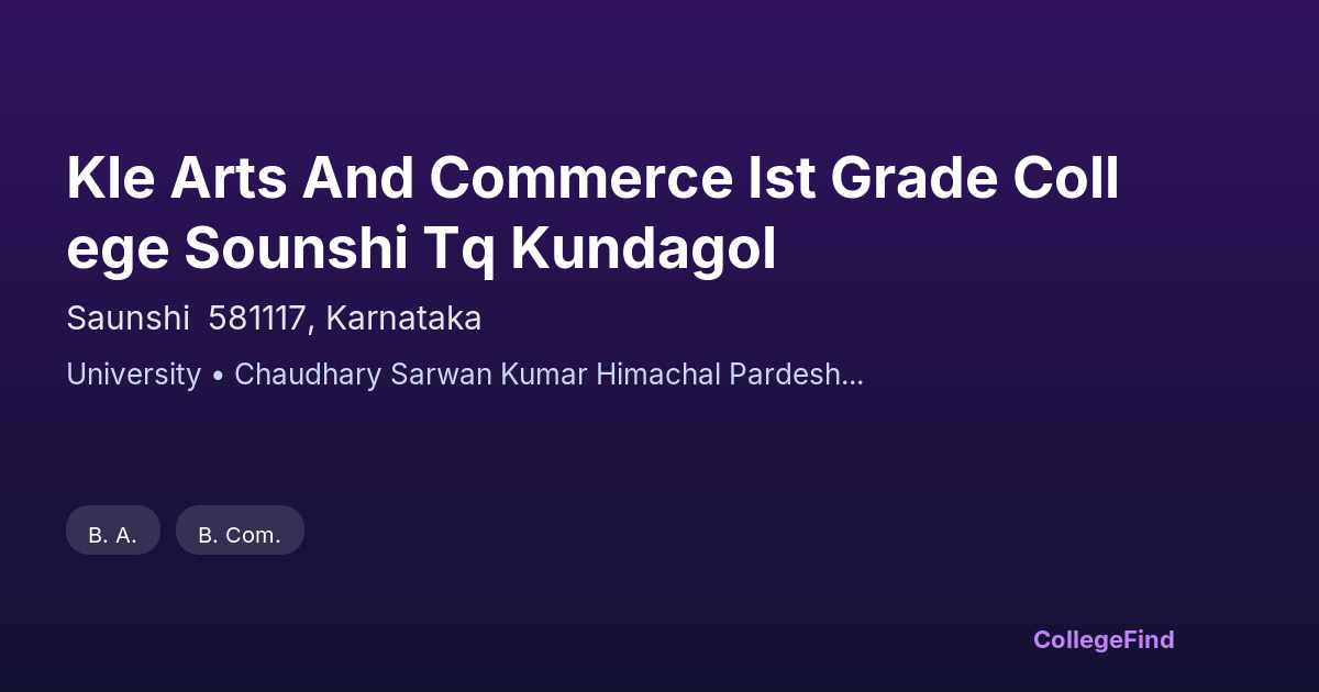 KLE Arts and Commerce Ist Grade College, located in Saunshi, Karnataka, was established in 2015. The college operates under private unaided management and is affiliated with a recognized university, ensuring its programs meet academic standards. With a campus spanning 4 acres, the institution offers a focused environment for studies in arts and commerce disciplines. The affiliation with the university supports a curriculum designed to prepare students for various career paths and higher education opportunities. The college emphasizes a structured academic framework, providing students access to quality teaching and resources aligned with university guidelines.