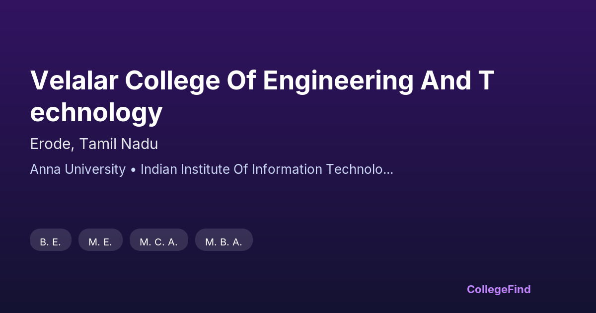 Velalar College of Engineering and Technology, established in 2001, is located in Erode, Tamil Nadu. As an affiliated college under Anna University, it operates as a private, unaided institution. The college benefits from its strategic location in Erode, a city known for its textile industry and growing industrial base, providing students with practical exposure and local internship opportunities. The campus spans over 25.6 acres, offering ample facilities for academic and extracurricular activities. With a focus on engineering education, the college aims to equip students with the skills needed to meet regional industry demands. The affiliation with Anna University ensures a curriculum that aligns with current academic standards, supporting students in both theoretical knowledge and practical application. This connection to the local economy and industry makes it a suitable choice for students seeking education linked closely to regional development.