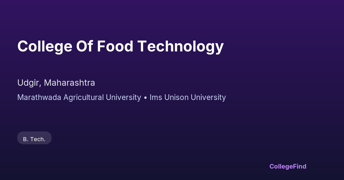The College of Food Technology, located in Udgir, Maharashtra, was established in 2010 and operates as an affiliated college under Marathwada Agricultural University. The college offers a focused curriculum designed to provide students with solid theoretical knowledge and practical skills in food technology. The affiliation with Marathwada Agricultural University ensures that the academic programs are regularly updated to meet current industry standards and scientific advancements in the field. The campus spans over 51 acres, providing adequate space for academic and research activities. Being managed by the university, the college maintains a structured academic environment conducive to learning and development. The institution emphasizes a comprehensive understanding of food processing, preservation, and safety, preparing students for various roles in the food technology sector.