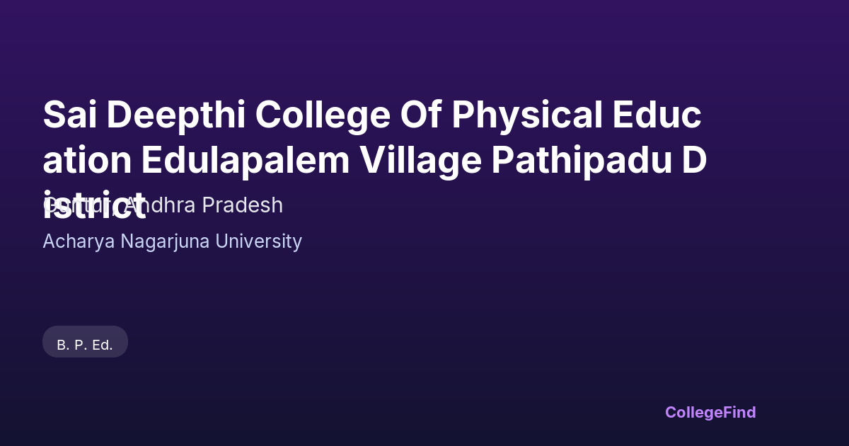 Sai Deepthi College of Physical Education, located in Edulapalem village of Pathipadu district, Guntur, Andhra Pradesh, was established in 2016. The college operates as a private un-aided institution affiliated with Acharya Nagarjuna University. It offers programs focused on physical education, aiming to equip students with both theoretical knowledge and practical skills in the field. While specific placement statistics and average salary packages are not provided, the college emphasizes a curriculum designed to prepare graduates for various roles in sports education, coaching, and fitness training. The campus provides a learning environment conducive to physical activity and academic growth, although detailed information about its size and facilities is not available. As an affiliated college, Sai Deepthi College follows the guidelines and academic framework set by its university, ensuring that students receive a recognized qualification upon completion of their studies.