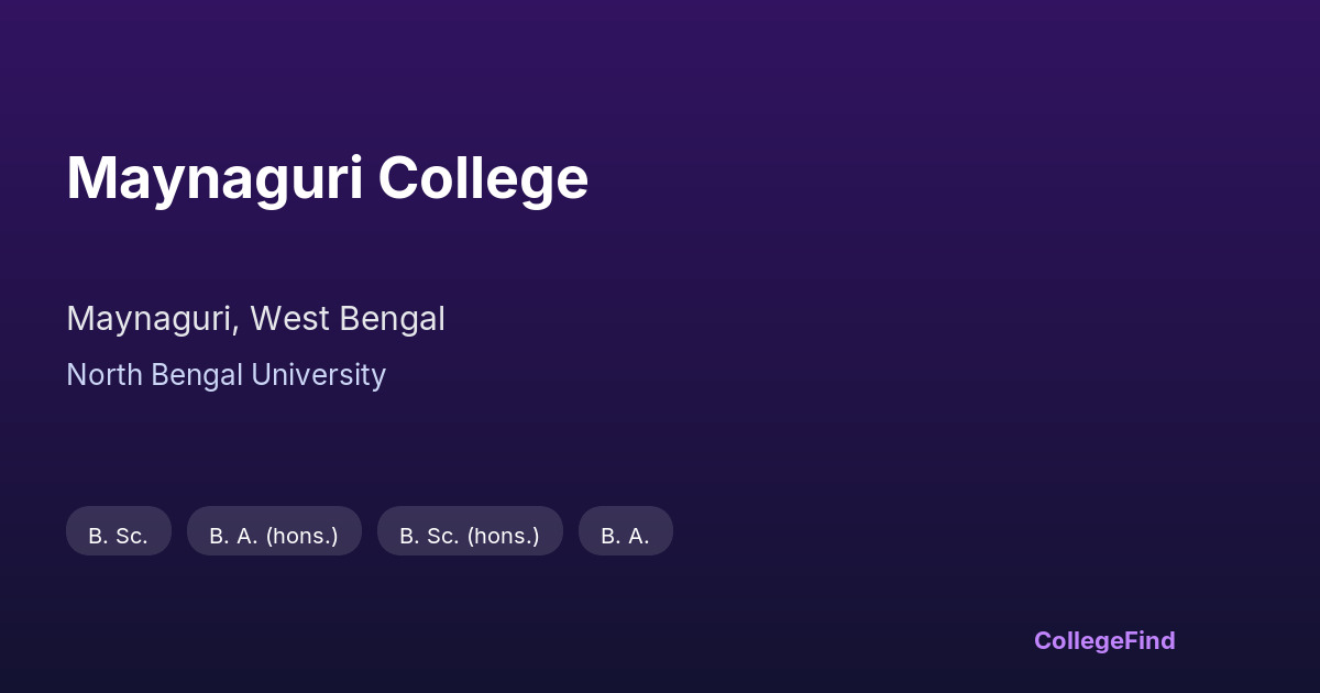 Maynaguri College, established in 1999, is located in Maynaguri, West Bengal. It operates as an affiliated college under North Bengal University and is managed by the state government. The campus spans approximately 11.67 acres, providing a spacious environment for academic and extracurricular activities. The college offers a range of undergraduate programs aligned with the curriculum prescribed by North Bengal University. While specific placement statistics and average salary packages are not available, the college focuses on delivering quality education and fostering overall student development. The institution maintains a commitment to accessible higher education for students in the region, supporting their academic growth and preparation for future opportunities.