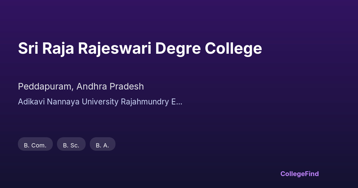 Sri Raja Rajeswari Degree College, located in Peddapuram, Andhra Pradesh, has been a significant part of my academic journey since its establishment in 2001. The college is affiliated with Adikavi Nannaya University in Rajahmundry, which ensures a curriculum aligned with current academic standards. As a private, unaided institution, the college maintains a focused approach towards providing quality education in various undergraduate programs. The faculty here are approachable and dedicated, helping students grasp concepts effectively. While the campus might not be very large, it offers a conducive environment for learning and extracurricular activities. Being an affiliated college, it emphasizes a balanced mix of theory and practical sessions, which has helped me prepare better for my future endeavors. Overall, Sri Raja Rajeswari Degree College in Peddapuram provides a dependable foundation for students pursuing higher education in this region.