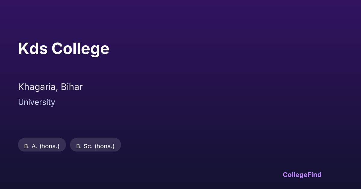 KDS College, established in 1961, is located in Khagaria, Bihar. As a constituent college managed directly by the university, it maintains a close academic relationship with its affiliating body, ensuring that its curriculum and standards align with university guidelines. The college offers a range of undergraduate programs and emphasizes a solid academic foundation for its students. With a campus spanning 5.47 acres, KDS College provides a focused learning environment, supporting both classroom instruction and related academic activities. Its status as a university-managed institution allows it to benefit from consistent academic oversight and resources, contributing to a structured educational experience for students in the region.