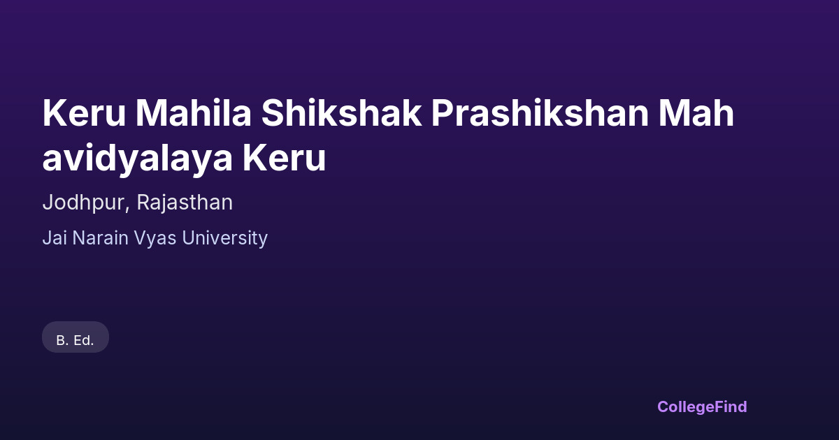 Keru Mahila Shikshak Prashikshan Mahavidyalaya Keru, located in Jodhpur, Rajasthan, was established in 2006. The college is affiliated with Jai Narain Vyas University and managed by a local body. It offers education focused on teacher training, aiming to prepare students for careers in the education sector. The campus spans approximately 1.25 acres, providing essential facilities to support academic activities. While specific placement statistics and average salary packages are not publicly available, the institution emphasizes practical training and skill development to enhance students' employability. The college works on equipping students with the necessary competencies to enter the workforce, particularly in teaching roles across the region. Its affiliation with Jai Narain Vyas University ensures adherence to academic standards, contributing to the overall career readiness of its graduates.