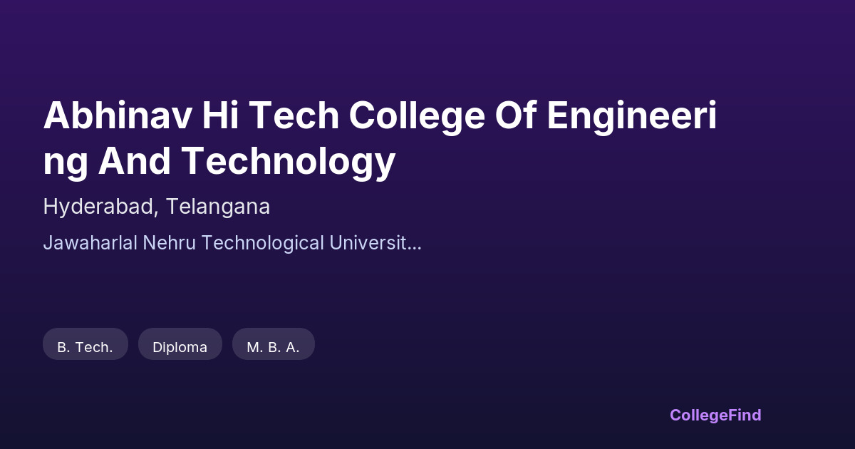 Abhinav Hi Tech College of Engineering and Technology, established in 2002, is located in Hyderabad, Telangana. The college operates as a private un-aided institution and is affiliated with Jawaharlal Nehru Technological University. With a campus spanning approximately 10.25 acres, it offers a focused environment for engineering education. The college aims to provide quality technical education to its students through various programs aligned with university standards. While detailed placement statistics and average salary packages are not specified, the institution maintains an academic framework designed to prepare students for industry challenges. Its affiliation with a well-known university ensures the curriculum stays current and relevant. Overall, Abhinav Hi Tech College serves as an accessible choice for engineering education in Hyderabad, balancing academics with opportunities for practical learning.