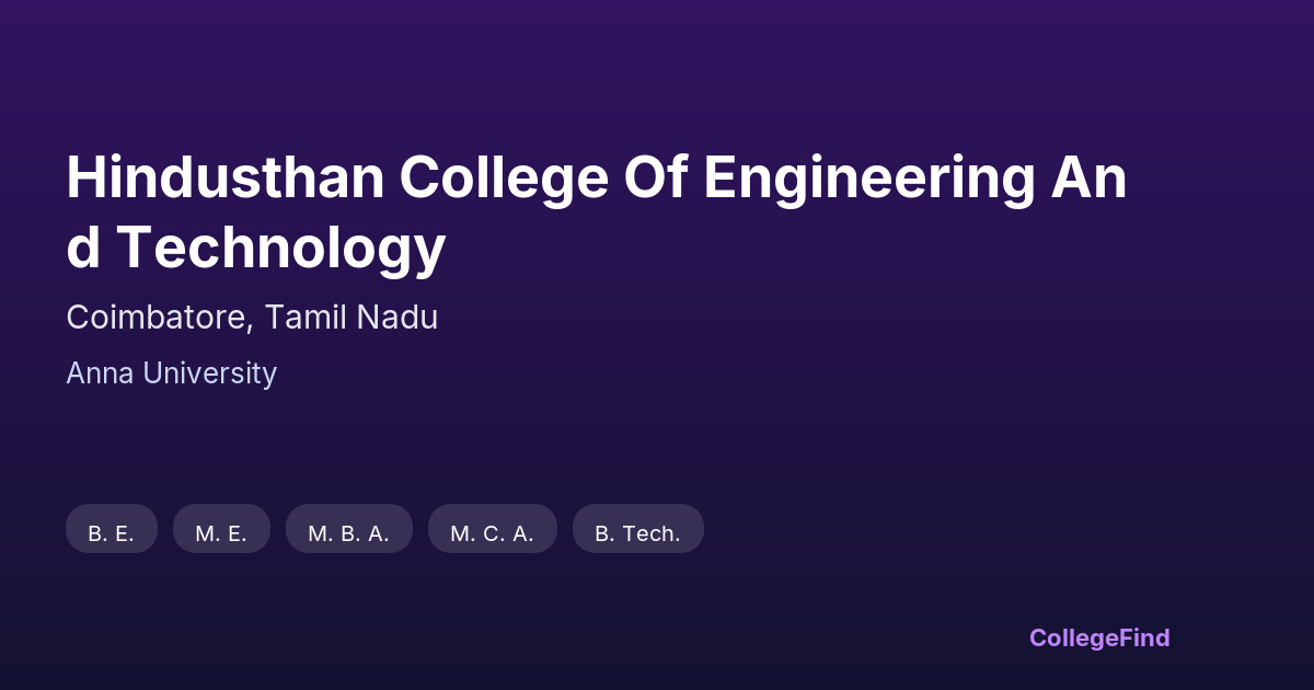 Hindusthan College of Engineering and Technology, located in Coimbatore, Tamil Nadu, was established in 2000 and is affiliated with Anna University. As a private unaided institution, it operates independently while adhering to the academic guidelines set by its affiliating university. The campus spans approximately 30 acres, providing students with adequate facilities for both academic and extracurricular activities. Compared to other engineering colleges in Tamil Nadu affiliated with Anna University, Hindusthan College offers a balanced environment for learning without the extensive industry links seen in some government or autonomous institutions. While detailed placement statistics and average salary packages are not publicly available, students can expect a typical experience similar to other private colleges in the region. The college emphasizes foundational engineering education, making it a suitable option for students seeking a consistent academic framework in Coimbatore.