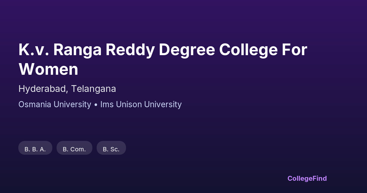 K.V. Ranga Reddy Degree College for Women, located in Hyderabad, Telangana, was established in 1994. It operates as a private unaided institution affiliated with Osmania University. The college focuses on providing higher education opportunities exclusively for women, aiming to foster academic growth in a supportive environment. The campus spans approximately 1.75 acres, offering adequate space for academic and extracurricular activities. As an affiliated college, it follows the curriculum and guidelines set by Osmania University, ensuring standardized education. While specific placement statistics and average salary packages are not publicly available, the institution emphasizes preparing students for various career paths through its courses and programs. Overall, K.V. Ranga Reddy Degree College for Women serves as an option for students seeking a degree under Osmania University’s syllabus, with a commitment to women’s education in Hyderabad.