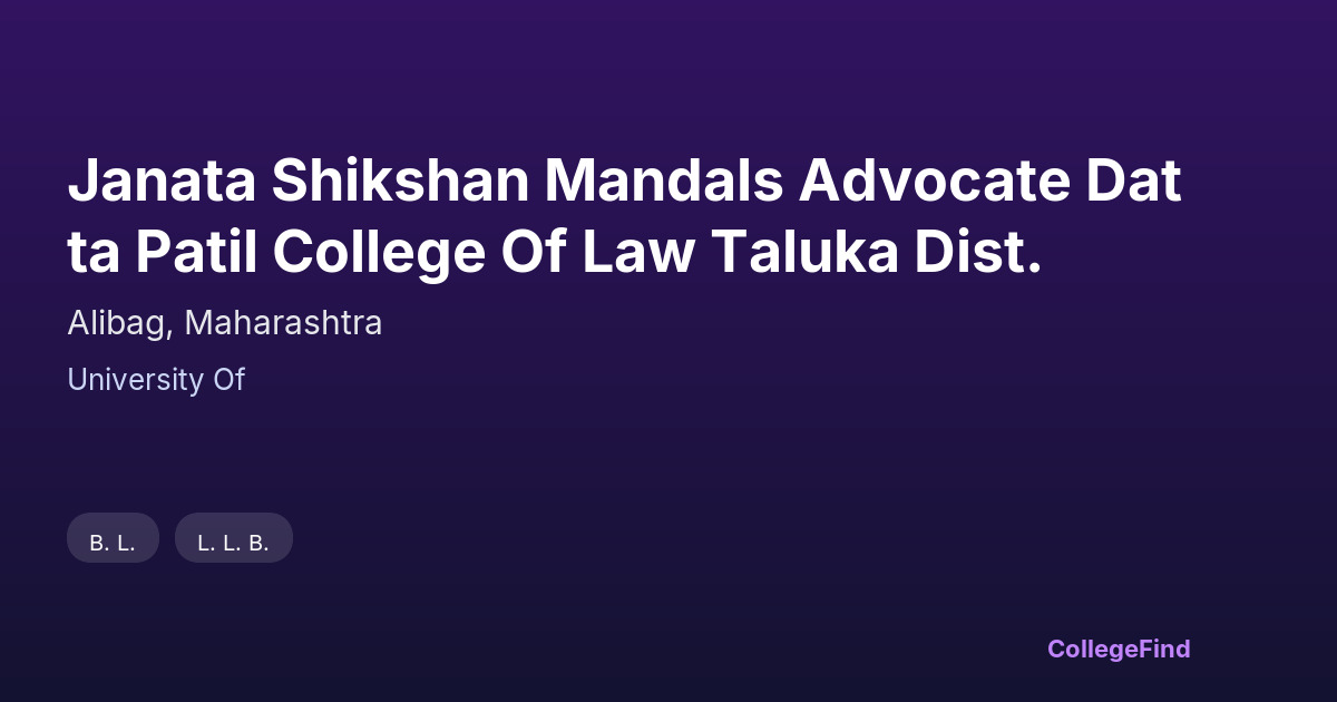Janata Shikshan Mandals Advocate Datta Patil College of Law, located in Alibag, Maharashtra, has been providing legal education since 2000. As a private unaided institution affiliated with the University of, the college offers a structured curriculum aimed at preparing students for various legal careers. The campus spans over 1541.9 square meters, providing adequate facilities to support both academic and extracurricular activities. While specific placement statistics and average salary packages are not available, the college focuses on equipping students with the knowledge and skills necessary to succeed in the competitive legal field. The affiliation ensures that the curriculum remains updated and aligned with university standards, enhancing the employability of graduates. Students can benefit from experienced faculty and a learning environment aimed at practical understanding, which is critical for careers in law. This college serves as a solid foundation for those looking to enter legal practice or related professions.