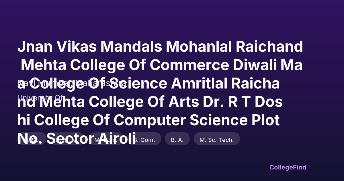 Jnan Vikas Mandals Mohanlal Raichand Mehta College of Commerce, Diwali Maa College of Science, Amritlal Raichand Mehta College of Arts, and Dr. R T Doshi College of Computer Science are located in Sector Airoli, Navi Mumbai. Established in 2001, this private unaided affiliated college operates on a campus spread over approximately 5,990 square meters. The campus is thoughtfully designed to support a comprehensive academic environment with dedicated spaces for commerce, science, arts, and computer science disciplines. Facilities include well-maintained classrooms, specialized laboratories, and computer centers that cater to the practical learning needs of students. The college's infrastructure emphasizes creating a conducive atmosphere for study and research, with areas for collaborative work as well as individual focus. Positioned in a rapidly developing urban area, the college benefits from good connectivity and access to city resources, enhancing the overall student experience.