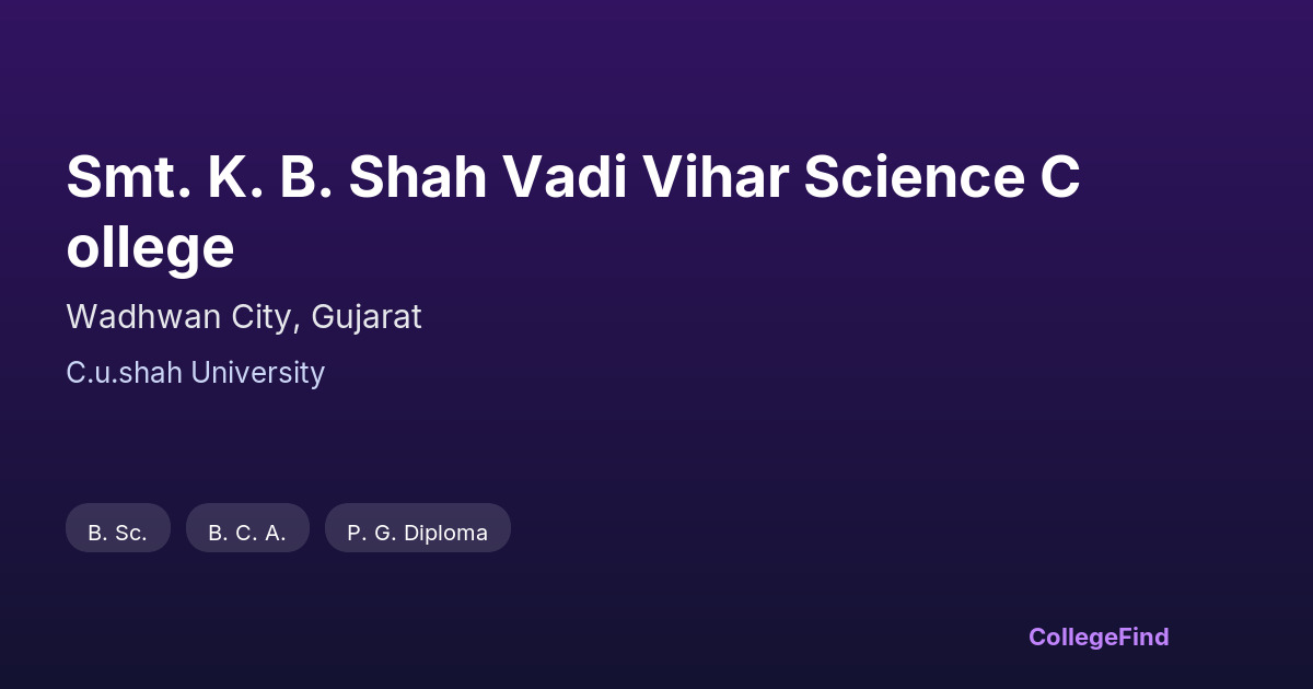 Smt. K. B. Shah Vadi Vihar Science College, established in 1999, is situated in Wadhwan City, Gujarat. Affiliated with C.U. Shah University, this private unaided institution operates as a constituent university college. The campus spans an area of 2.5 acres, providing a compact yet focused environment for science education. The infrastructure supports a range of science disciplines with well-maintained classrooms and laboratories equipped to facilitate practical learning and research. The college prioritizes creating a conducive academic atmosphere through its functional facilities, including dedicated spaces for student activities and study. Its location within Wadhwan City offers accessibility while maintaining a quiet setting for focused study. Overall, the campus infrastructure supports the academic needs of its students, emphasizing hands-on experience and effective learning in the sciences.
