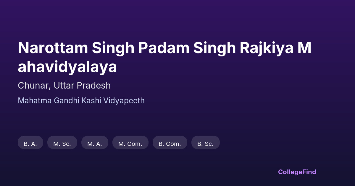 Narottam Singh Padam Singh Rajkiya Mahavidyalaya, established in 2001, is located in Chunar, Uttar Pradesh. Affiliated with Mahatma Gandhi Kashi Vidyapeeth, this state government-managed college offers a collegiate environment dedicated to academic growth. The campus spans approximately 3.553 acres, providing ample space for classrooms, administrative buildings, and recreational areas. The infrastructure is designed to support a conducive learning atmosphere with well-maintained facilities that cater to the needs of students and faculty alike. While the college focuses primarily on offering quality education, it also ensures that the campus environment supports both academic and extracurricular activities. Its urban location in Chunar allows students convenient access to local resources and amenities, contributing to a balanced college experience.