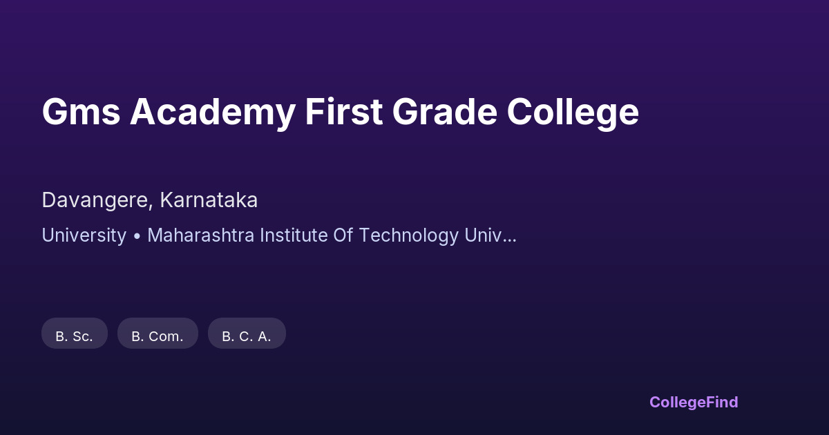 GMS Academy First Grade College, established in 2011, is located in Davangere, Karnataka. As a private unaided institution affiliated with the university, it offers undergraduate programs designed to meet academic and professional standards. The campus spans 25 acres, providing a focused environment for learning and development. The college emphasizes quality education through qualified faculty and structured curriculum aligned with university guidelines. While it is an affiliated college, GMS Academy First Grade College strives to equip students with the skills necessary for their careers. Details regarding placement percentages and average salary packages are not specified. Overall, the college serves as an option for students seeking undergraduate education within the region.