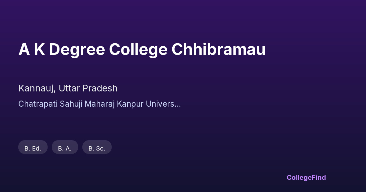 A K Degree College Chhibramau, located in Kannauj, Uttar Pradesh, was established in 2014. The college is affiliated with Chhatrapati Shahu Ji Maharaj Kanpur University, Kanpur, ensuring its academic programs meet the standards set by the university. As a private un-aided institution, the college operates independently, focusing on providing quality higher education to its students. The campus spans an area of approximately 3 acres, offering a conducive environment for learning. The affiliation with Kanpur University allows the college to offer a range of undergraduate courses with a curriculum designed to prepare students for various professional fields. By maintaining academic affiliation, the college continually updates its educational offerings in line with university guidelines, supporting student growth and development.