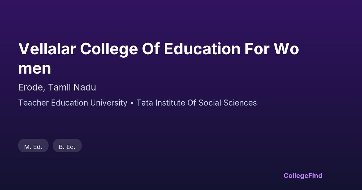 Vellalar College of Education for Women, located in Erode, Tamil Nadu, was established in 2005. It operates as a private unaided institution affiliated with the Teacher Education University. The college is dedicated to providing quality teacher education specifically for women, focusing on preparing competent educators for various academic settings. Situated on a campus spanning 10.28 acres, the college offers a conducive environment for learning and personal development. While specific placement percentages and average salary packages are not provided, the institution emphasizes comprehensive training and practical experience to enhance employability. As an affiliated college, it follows the curriculum and guidelines set by its university, ensuring standardized education and assessment. Vellalar College of Education for Women continues to contribute to the field of teacher education in the region, supporting women in their pursuit of a professional teaching career.