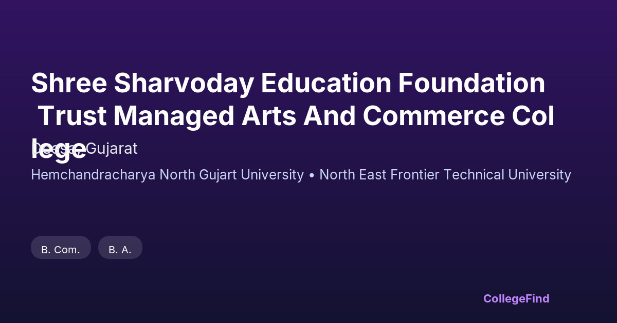 Shree Sharvoday Education Foundation Trust Managed Arts and Commerce College, located in Deesa, Gujarat, has been providing quality education since its establishment in 2018. As an affiliated college under Hemchandracharya North Gujarat University, it offers a focused curriculum in arts and commerce that prepares students for various career paths. The private un-aided management ensures a dedicated approach toward maintaining academic standards. The campus spans 5 acres, providing adequate space for classrooms and other essential facilities. While the college is still growing in terms of placement statistics and industry connections, the supportive faculty and friendly environment make it a good place to learn and develop skills. Overall, it’s a solid choice for those seeking a focused education in arts and commerce within Deesa.