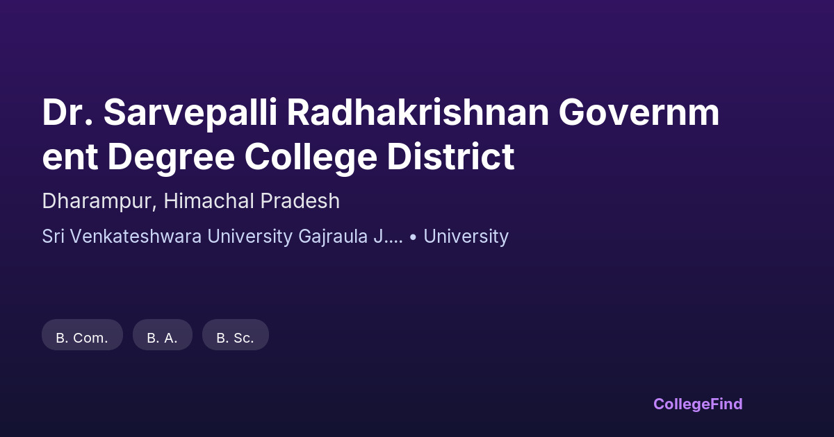 Dr. Sarvepalli Radhakrishnan Government Degree College, located in Dharampur, Himachal Pradesh, was established in 2007. It operates under the state government and is affiliated with Sri Venkateshwara University, Gajraula J.P. Nagar. The college offers undergraduate programs across various disciplines, catering mainly to students from the local region. With a campus area of 2.34 acres, the college provides a compact environment suitable for focused academic activities. Compared to other affiliated colleges in Himachal Pradesh, its government management typically ensures moderate tuition fees and access to state-supported resources. However, detailed placement statistics and average salary packages are not prominently available, which may be a consideration for students prioritizing post-graduation employment prospects. Overall, this institution may appeal to students looking for an affordable education option affiliated with a recognized university, especially those based in and around Dharampur. Prospective students should compare curriculum offerings and facilities when considering other nearby government or private degree colleges.