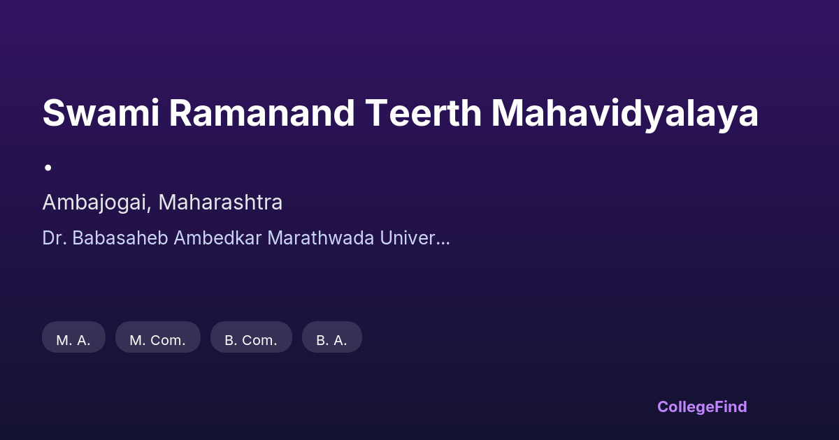 Swami Ramanand Teerth Mahavidyalaya, located in Ambajogai, Maharashtra, was established in 1970. The college is affiliated with Dr. Babasaheb Ambedkar Marathwada University, Aurangabad, and operates as a private aided institution. Situated in a region known for its rich cultural heritage, the college serves as an accessible educational center for students from Ambajogai and surrounding areas. With a campus area of 9.6 acres, it offers a peaceful environment conducive to learning. The college plays a significant role in providing higher education opportunities to local youth, supporting their academic growth and career aspirations. Its affiliation with a reputable university ensures that the curriculum and academic standards meet regional and national educational requirements. Swami Ramanand Teerth Mahavidyalaya continues to contribute to the community by equipping students with essential knowledge and skills, fostering development in this part of Maharashtra.