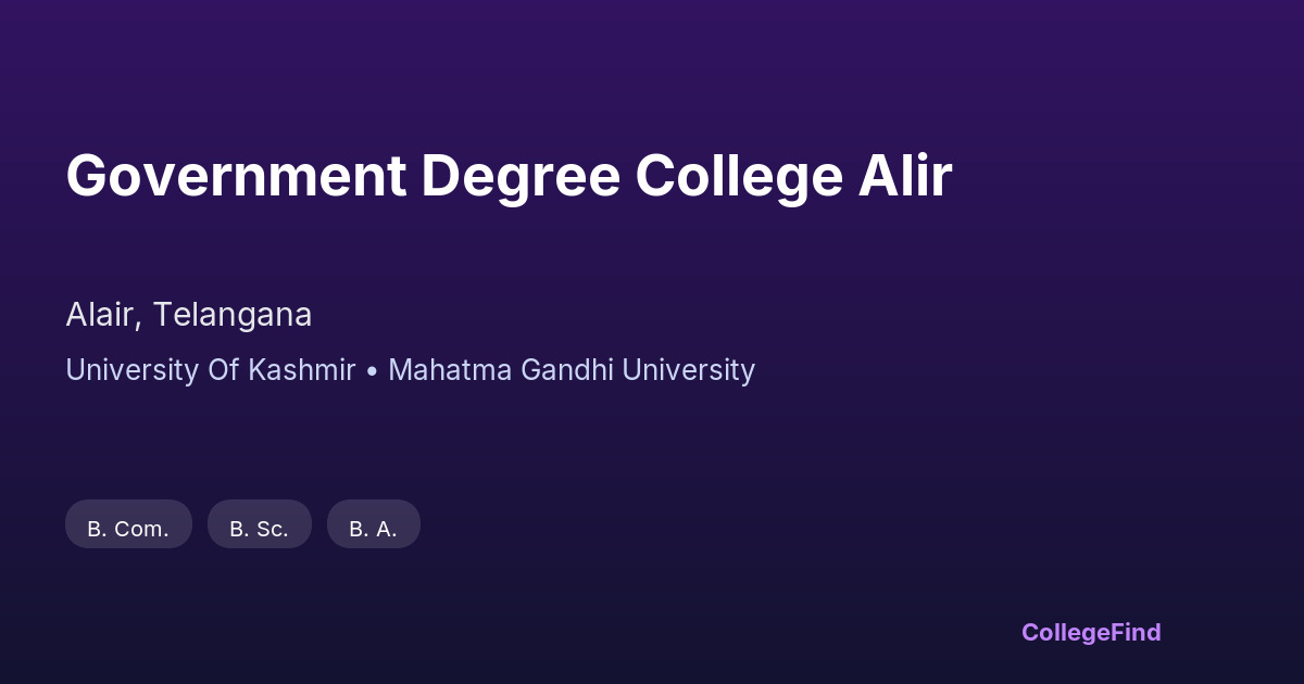 Government Degree College Alair, located in Alair, Telangana, was established in 2008. The college operates under the management of the state government and maintains an affiliation with the University of Kashmir. As an affiliated institution, it offers undergraduate courses across various disciplines, aiming to provide accessible higher education to the local community. The campus covers an area of approximately 10 acres, providing essential facilities to support academic activities. While specific placement statistics and average salary packages are not publicly available, the college focuses on delivering a solid academic foundation to its students. Government Degree College Alair plays a role in expanding educational opportunities in the region, supporting students in their academic and personal development.