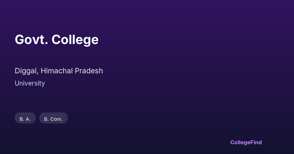 Govt. College, established in 2014, is located in Diggal, Himachal Pradesh. As an affiliated college managed by the university, it maintains a strong academic connection with the parent institution, ensuring that its programs meet prescribed standards. The college offers a range of courses aligned with university curricula, providing students with opportunities to engage in comprehensive academic learning. Situated on a campus spanning 6.53 acres, the college supports its educational activities with appropriate infrastructure. While specific placement statistics and average salary packages are not available, the college’s primary focus remains on delivering quality education through its affiliation. This connection facilitates access to updated syllabi, examinations, and academic regulations set by the university, benefiting students through structured academic guidance. Overall, Govt. College in Diggal provides an environment conducive to learning within the framework of university affiliation, helping students build solid academic foundations.