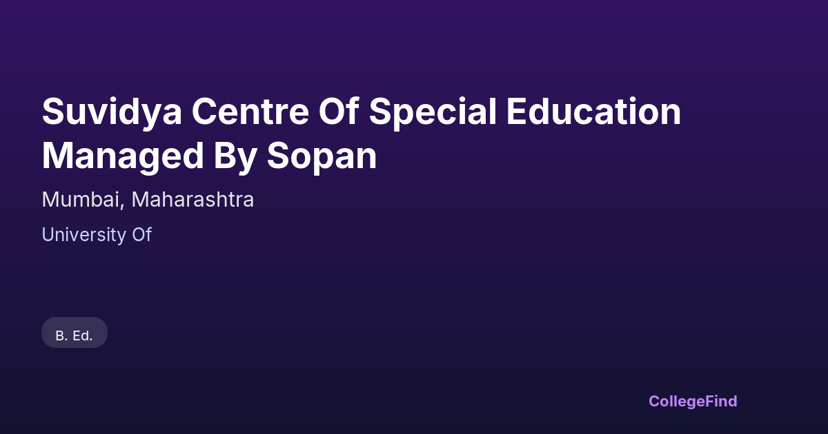 Suvidya Centre of Special Education, managed by Sopan, is located in Mumbai, Maharashtra. Established in 2015, this private unaided affiliated college aims to provide specialized education and support for students with diverse learning needs. Situated in one of India's most dynamic and multicultural cities, Suvidya benefits from Mumbai’s extensive resources and accessibility, including proximity to various healthcare and educational institutions. The college focuses on fostering an inclusive environment, tailored to empower students through specialized programs. While it is affiliated with a university, the centre emphasizes practical approaches to education, preparing students to engage confidently within their communities. Its location in Mumbai also offers opportunities for collaboration with local organizations, enhancing the learning experience. Suvidya Centre remains committed to supporting students with disabilities through dedicated services and qualified staff, contributing to a more inclusive educational landscape in Maharashtra.